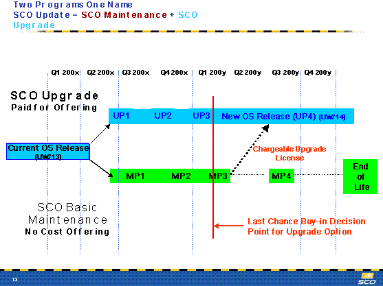 This option is for customers who want early access to new operating system features. This optional service is available for UnixWare 7.1.4, OpenServer 5.0.7 and later releases of those platforms. It is fee-based and requires an additional license for each system covered by the upgrade option.